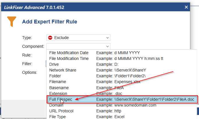 Next, set the "Component" to "Full file spec"