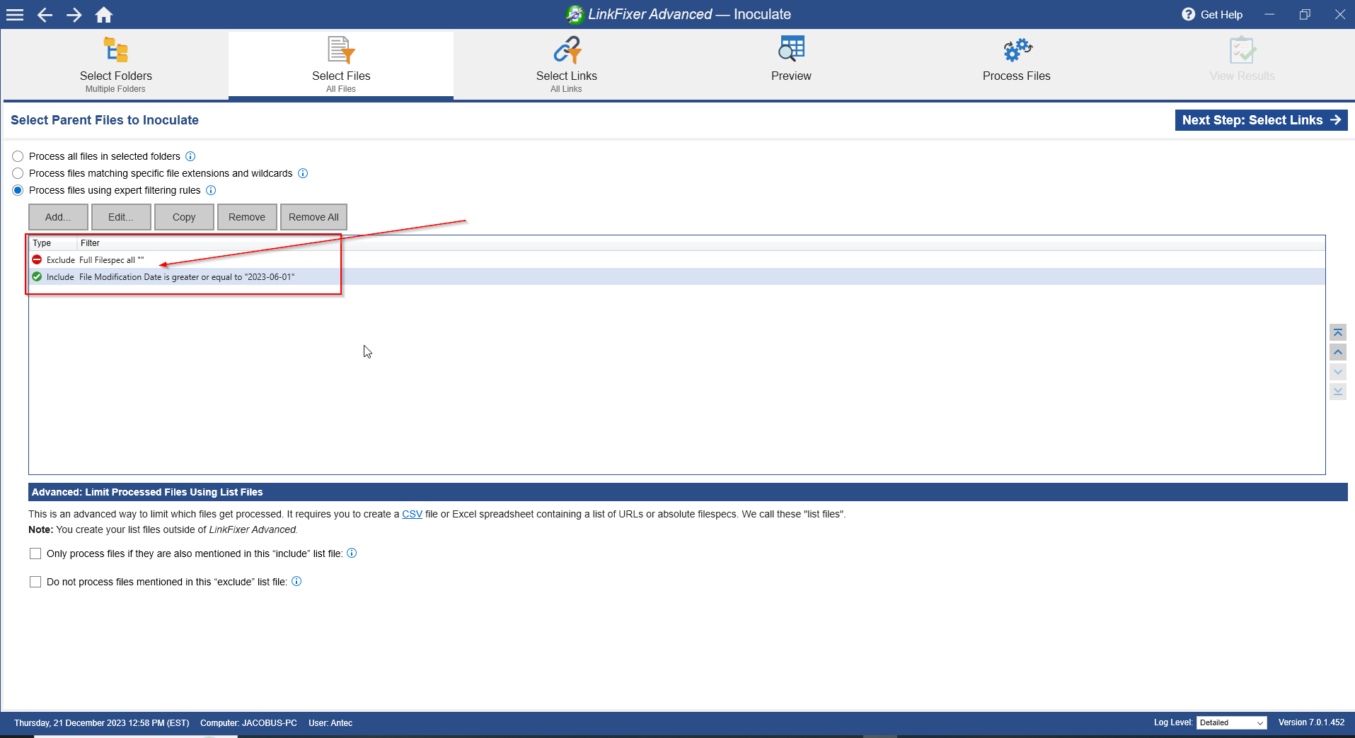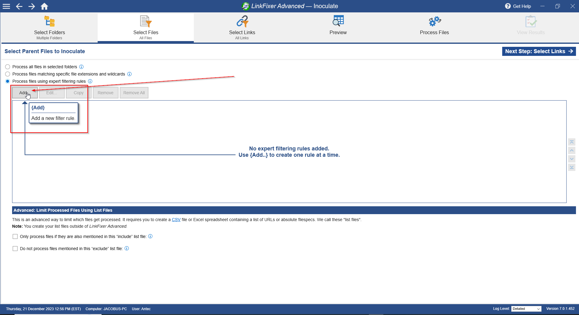 Next in the "Select Files" view. Select the "Process files using expert filtering rules."